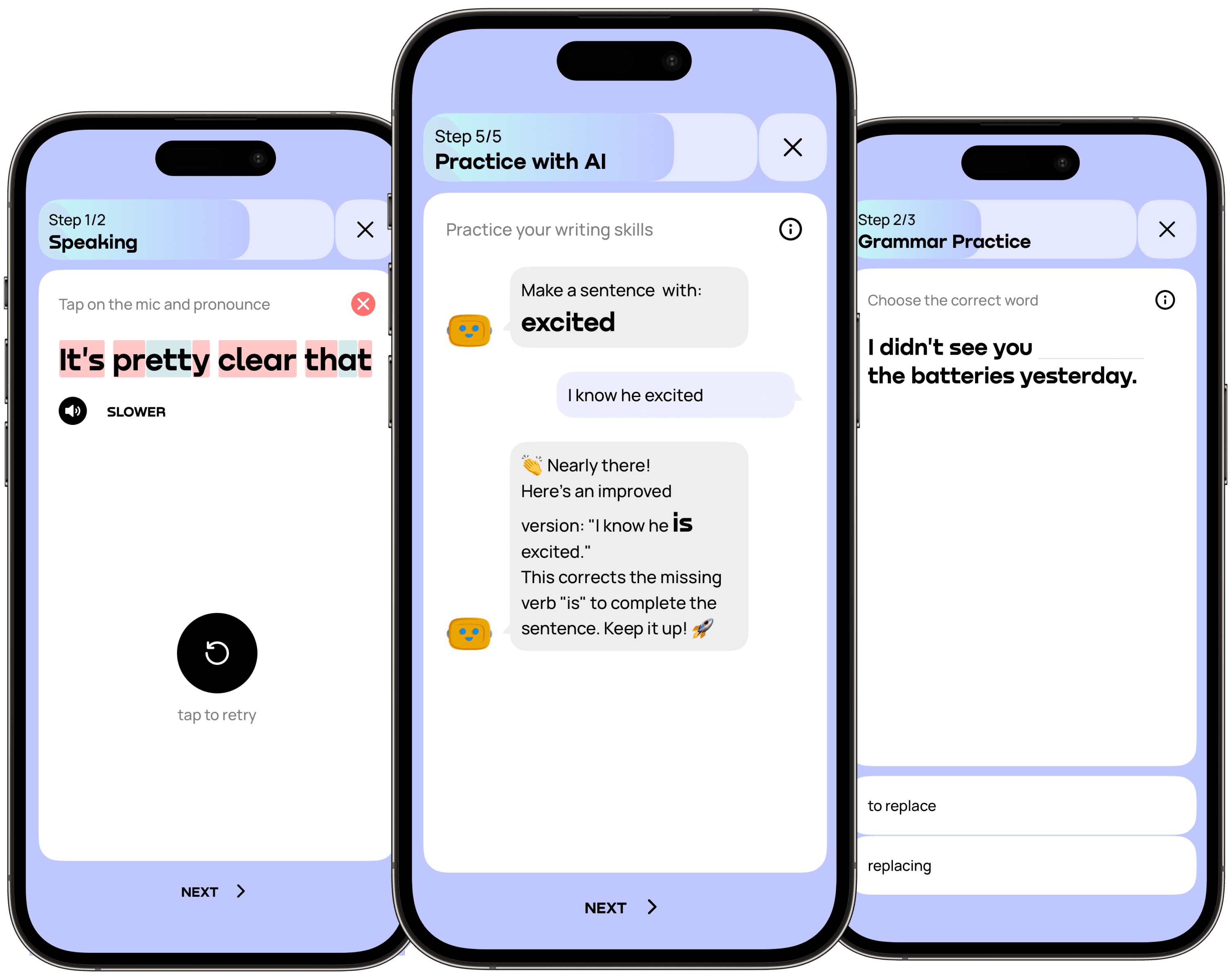 Recibe correcciones gramaticales, sugerencias de vocabulario y orientación adaptada a tu progreso.