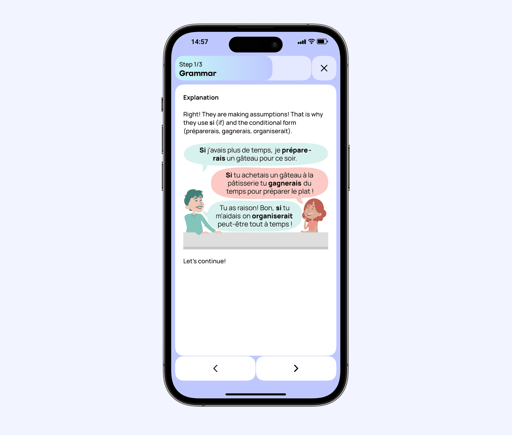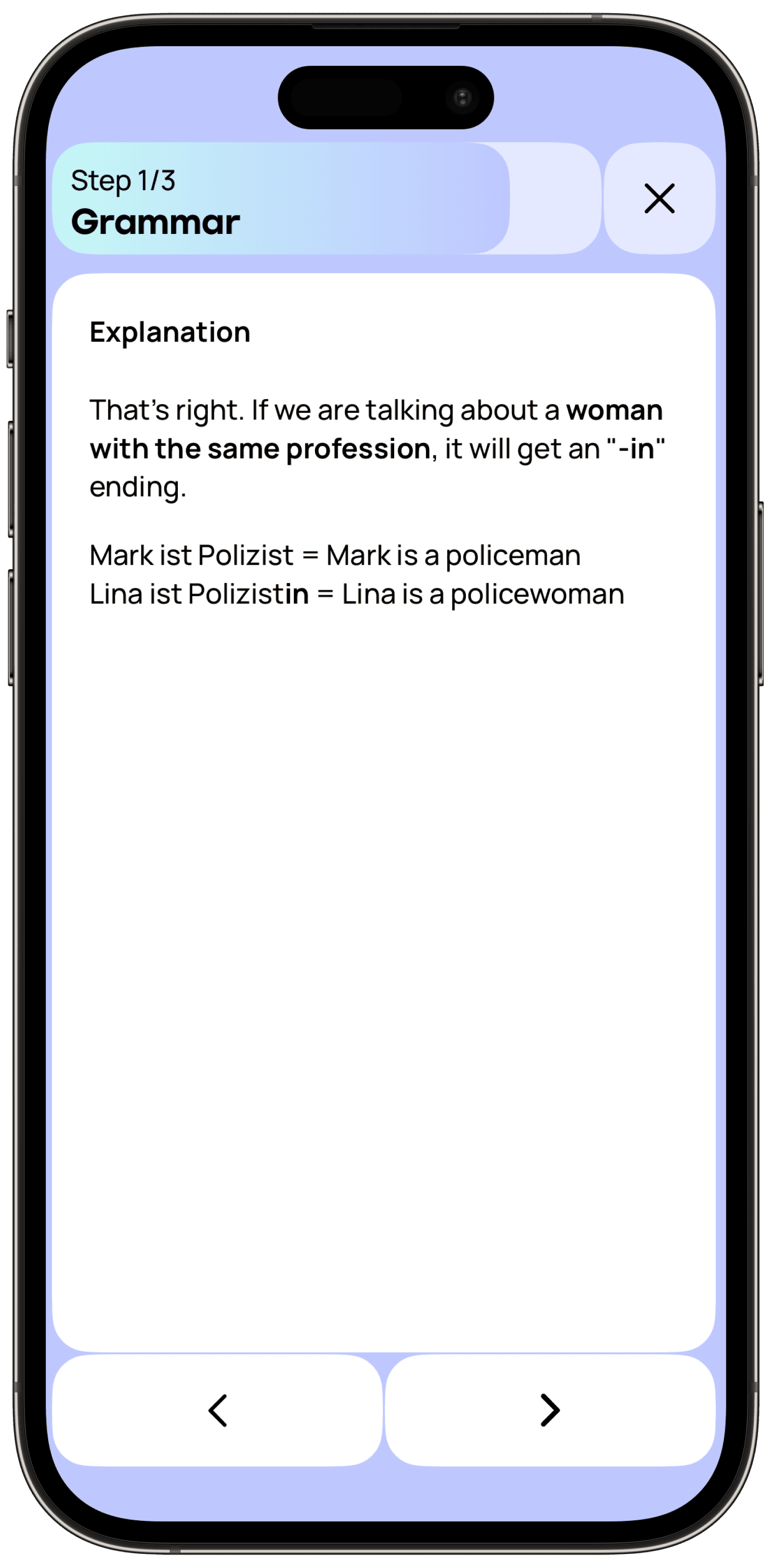 Promova adapta cada lección de gramática alemana a tu ritmo y progreso individual. La app analiza tu desempeño e identifica las áreas de mejora, ofreciéndote ejercicios de gramática alemana personalizados que hacen que dominar temas complejos (como los casos, los artículos y el orden de las palabras) sea más fácil y rápido.