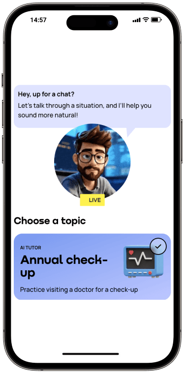 ..Tanto si eres principiante como avanzado, el tutor AI se adapta a tu nivel y ritmo. Cada sesión ofrece retroalimentación útil para mejorar tu pronunciación, gramática y vocabulario. Con el tutor AI de Promova, puedes practicar tantas veces como quieras, ganar confianza y disfrutar del aprendizaje sin estrés.