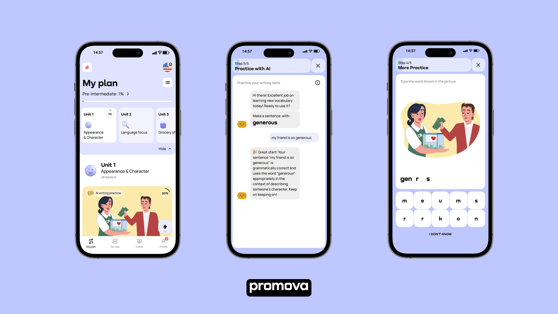 ..Promova est la meilleure application d'apprentissage des langues par l'IA pour s'entraîner à parler. Préparez-vous pour votre voyage, réussissez votre prochain entretien ou ayez l'air naturel dans n'importe quelle conversation grâce aux outils d'apprentissage de l'IA de Promova. Nous sommes là pour vous aider - à tout moment et en tout lieu.
