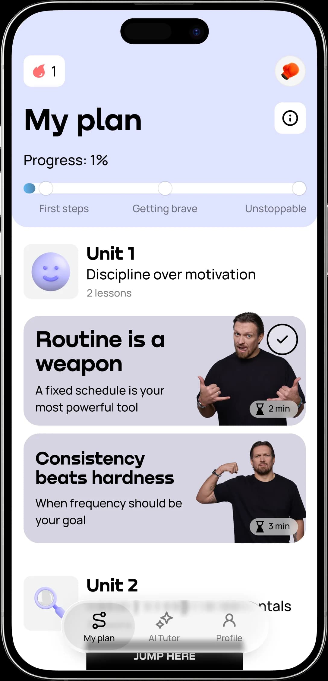 C'est totalement normal. Cette expérience est justement pensée pour ces moments-là. Le mode Usyk et le système d'apprentissage Promova sont conçus pour vous aider à continuer sans dépendre uniquement de la motivation.
