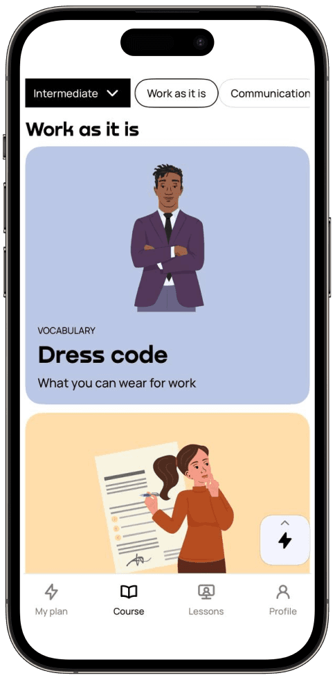 Un niveau B1 minimum est nécessaire pour communiquer au travail. Commencez par enrichir votre vocabulaire, des sujets généraux aux notions spécifiques à votre secteur. Découvrez différents thèmes et entraînez-vous à parler chaque jour pour être prêt à toute situation.