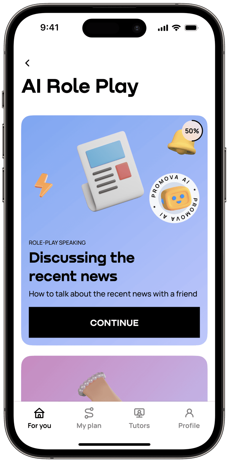 With Promova language learning app features, like bite-sized lessons, AI tools, and a personalized plan, you can reach your goals faster. Join more than 20 million learners and enjoy your best language journey yet.