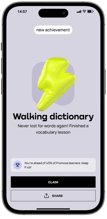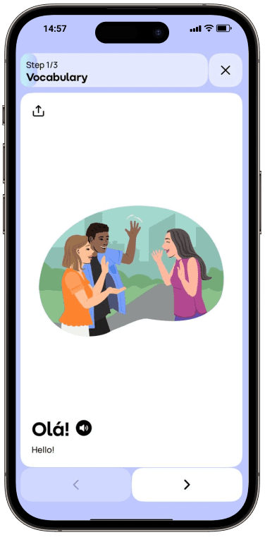 O português é considerado um idioma de Categoria I pelo Foreign Service Institute (FSI). Isso significa que, semelhante ao espanhol e ao francês, normalmente são necessárias cerca de 600 a 750 horas de estudo para atingir a proficiência. Com as lições curtas, os diálogos reais e os planos personalizados da Promova, você terá um progresso constante sem se sentir sobrecarregado. Os erros fazem parte da jornada, e nós comemoramos cada passo seu.