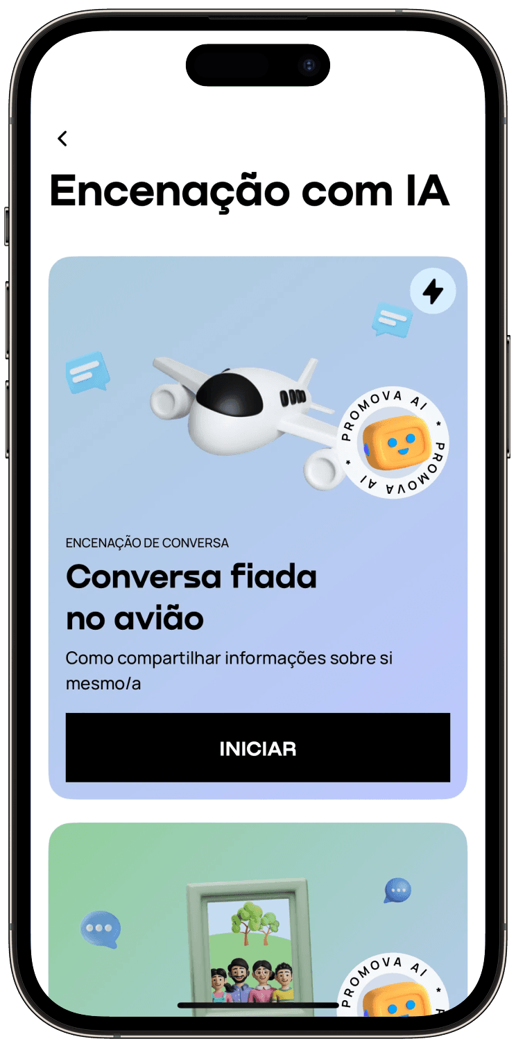 Eu usava o Duolingo, mas a Promova parece mais uma escola de verdade do que só um jogo. Sinto que estou realmente aprendendo com professores, porque tem vídeos curtos, livros, e a IA também é muito legal.
