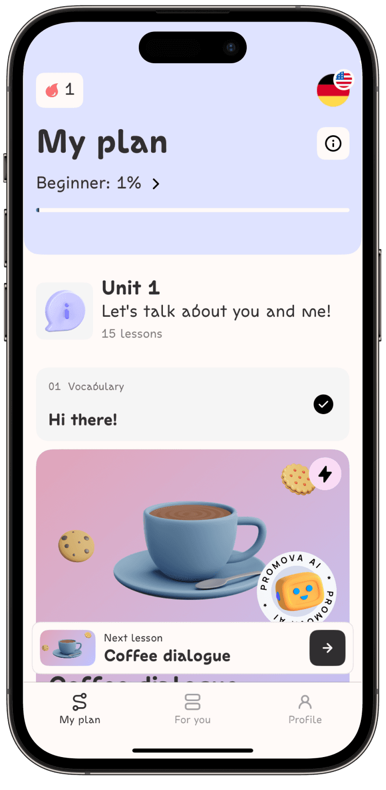 Regardless of your level, you can boost your German vocabulary with Promova. Enjoy fun lessons with a personalized learning plan and master the German language with its unique slang, idioms, and conversation phrases.